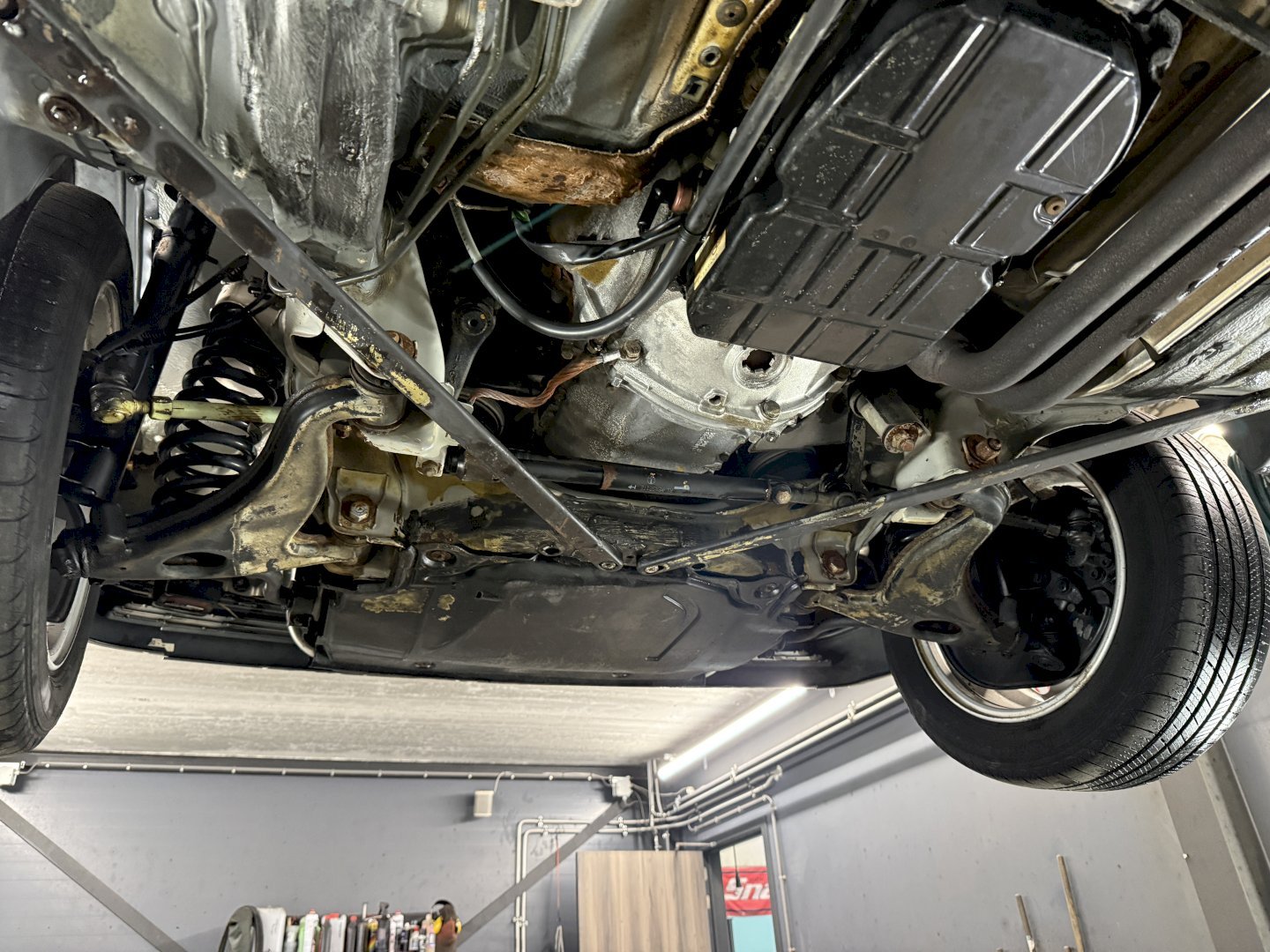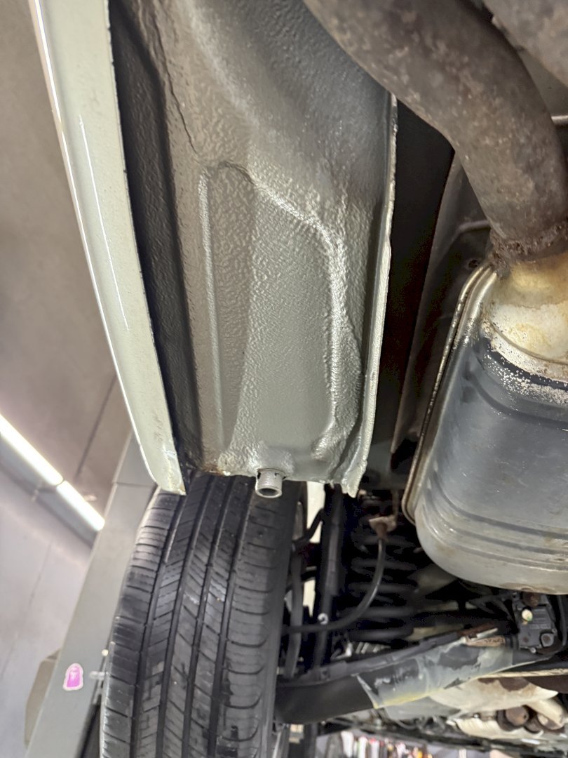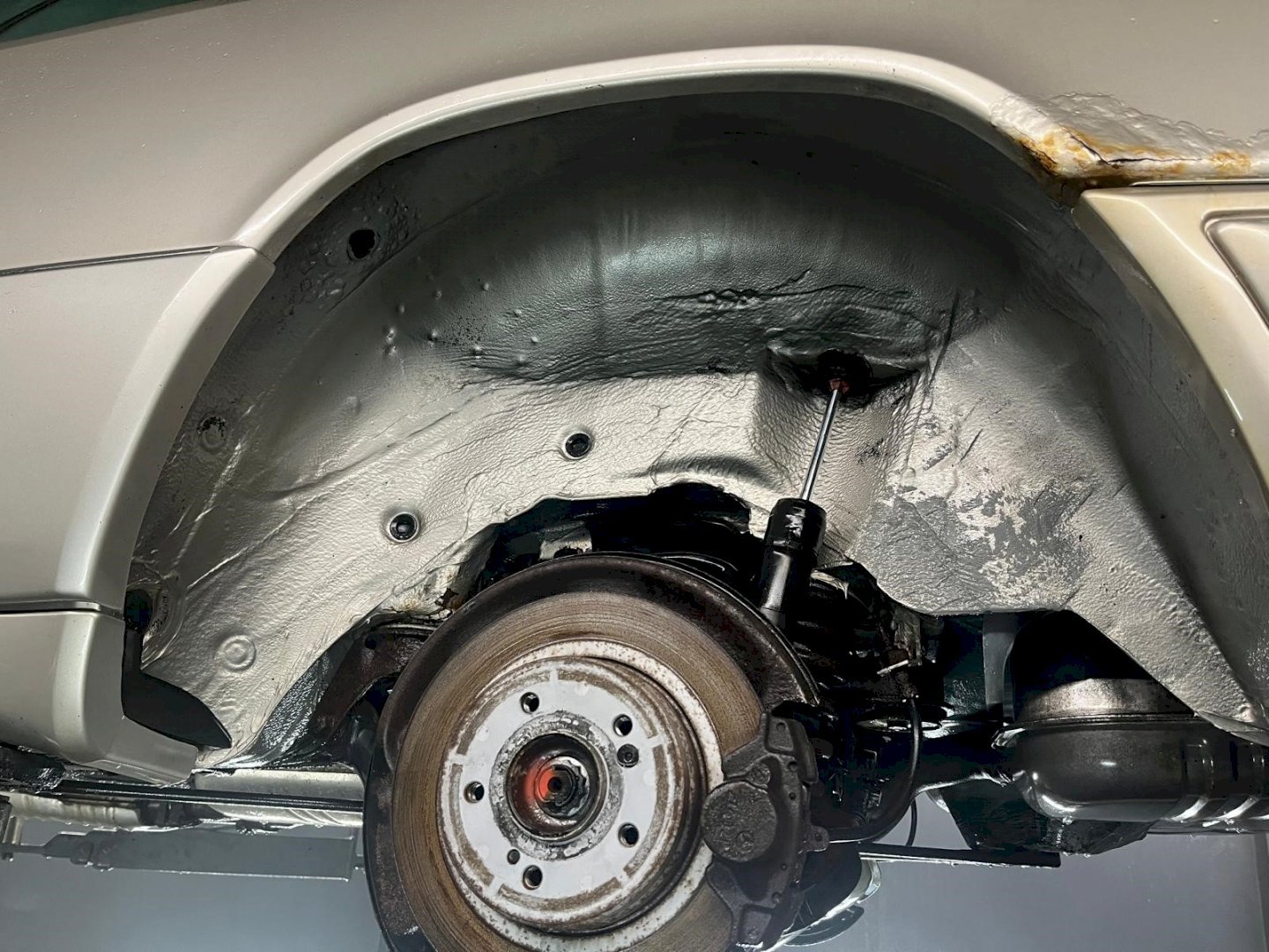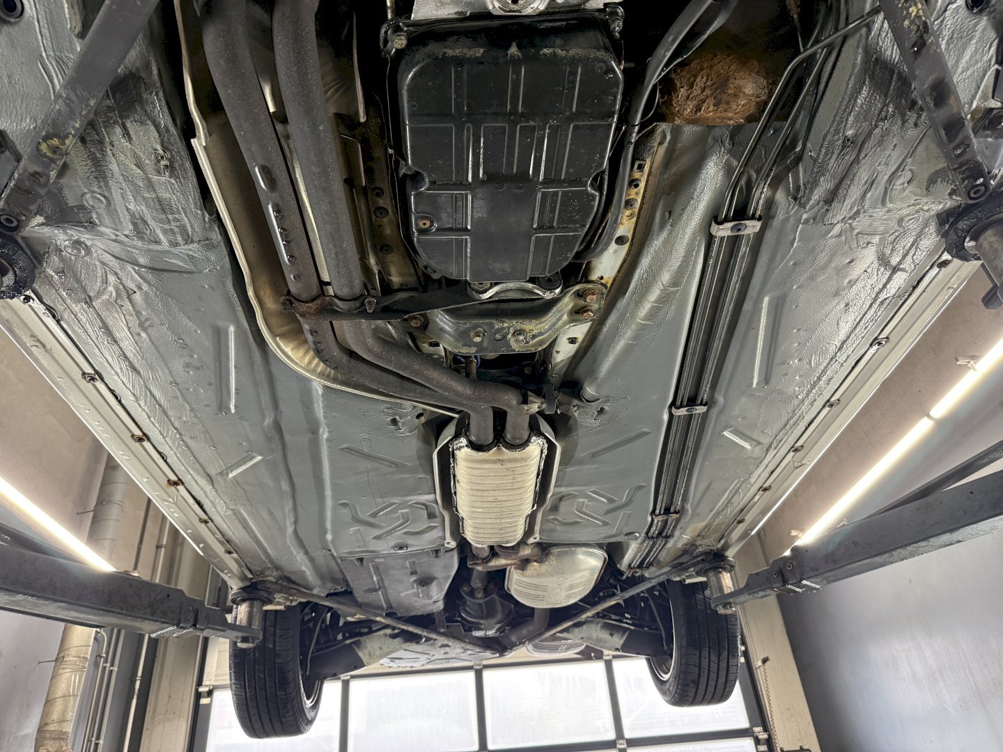 The body shows rust holes in certain areas, though notably the underside is in very nice, original condition, which is a strong positive for a convertible of this age. The car appears structurally sound underneath and has not been modified.