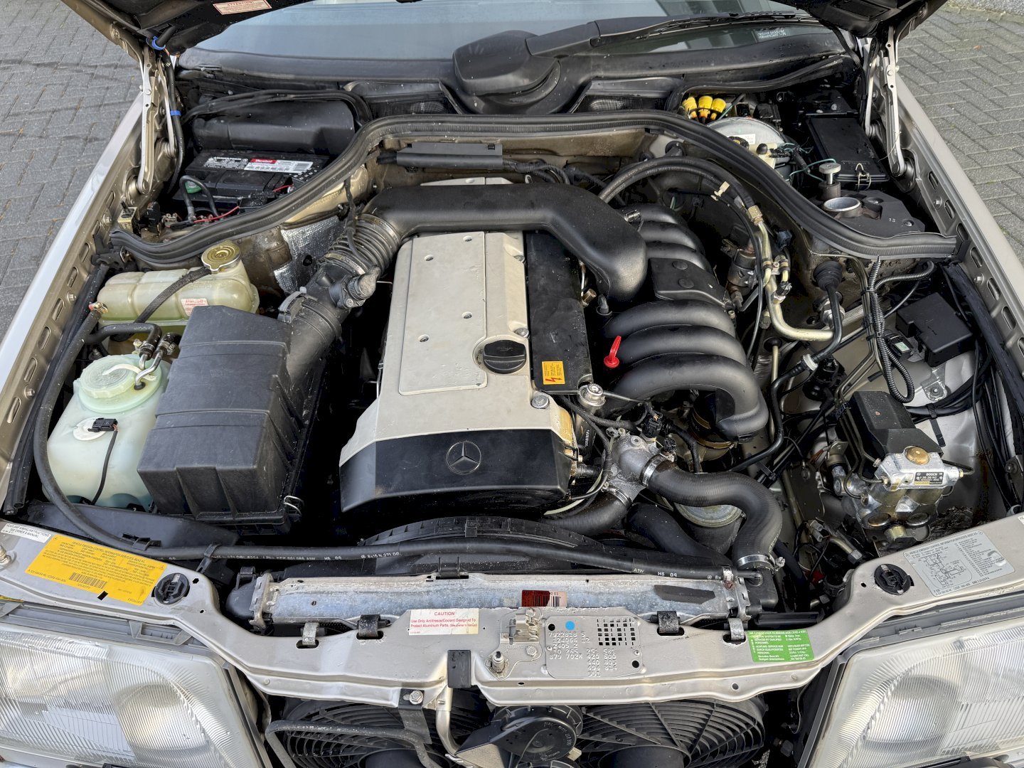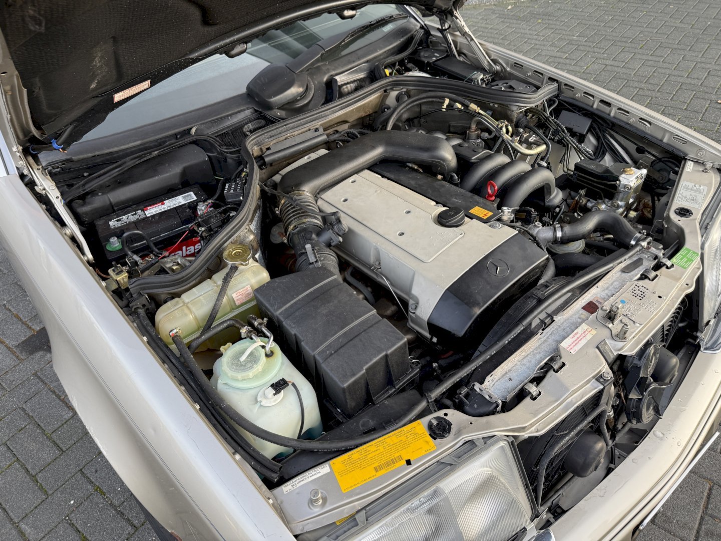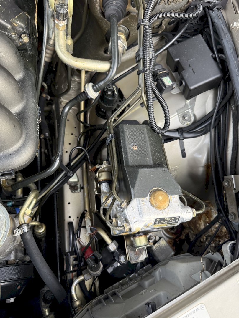 The engine starts, however it runs poorly. The engine wiring harness is in bad condition, a known issue on Mercedes models of this era due to the biodegradable insulation used at the time. Replacement or repair of the wiring harness will be necessary.
